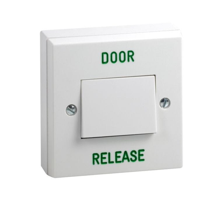 Surface-mounted plastic exit button with wide switch action and engraved “DOOR RELEASE”. Designed for professional request-to-exit and door release points.