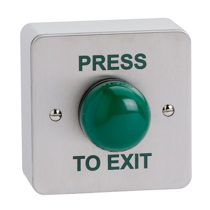 High impact surface mounted green dome exit button printed PRESS TO EXIT.